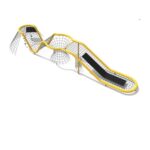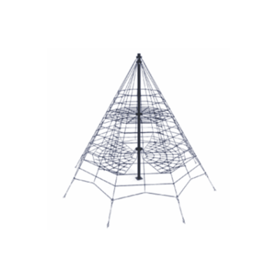 Descripción: Pirámide tridimensional C4,5m, compuesto por 1 poste redondo central de acero galvanizado y lacado a RAL 600 deep blue gris forja. Red para trepar en forma de pirámide, con dos plataformas en red, fabricada en cuerda reforzada en acero recubierto por fibras de polipropileno Ø16mm.