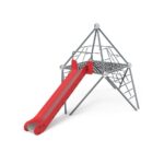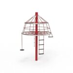 lacado a RAL 3000 rojo fuego, a una temperatura de 230°C y por un aro en tubo de acero Inox de Ø60mm, con un diámetro máximo de Ø3000mm. Red de color rojo para trepar en forma de cono, fabricada en cuerda reforzada de acero revestido por fibras de polipropileno de Ø16mm.