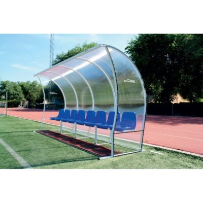 - Banquillo de fútbol fabricado en perfil de acero, cerrado lateralmente por placas de policarbonato transparente, y en su parte trasera mediante placas de policarbonato makrolon SPD. El policarbonato compacto, es utilizado en los escudos de la policía para evitar golpes, siendo prácticamente irrompibles.