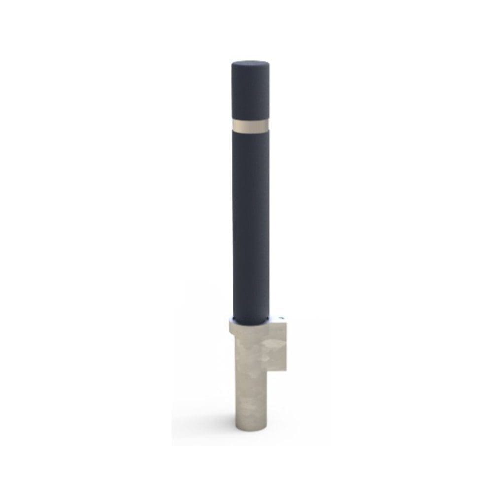 Pilona fabricada en tubo Ø 90mm en acero de carbono, decapado, con tratamiento primario a base de zinc C5 y acabado lacado a RAL gris forja 600 deep blue, a temperatura de 230°C.