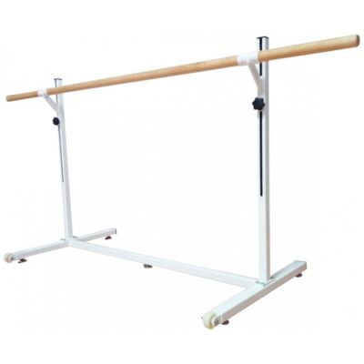 El soporte metálico está formado por una sola pieza con refuerzo horizontal, niveladores y sistema de regulación en altura, consiguiendo una correcta utilización de la misma. Dicho juego incluye la barra de ballet fabricada en madera de pino barnizada.