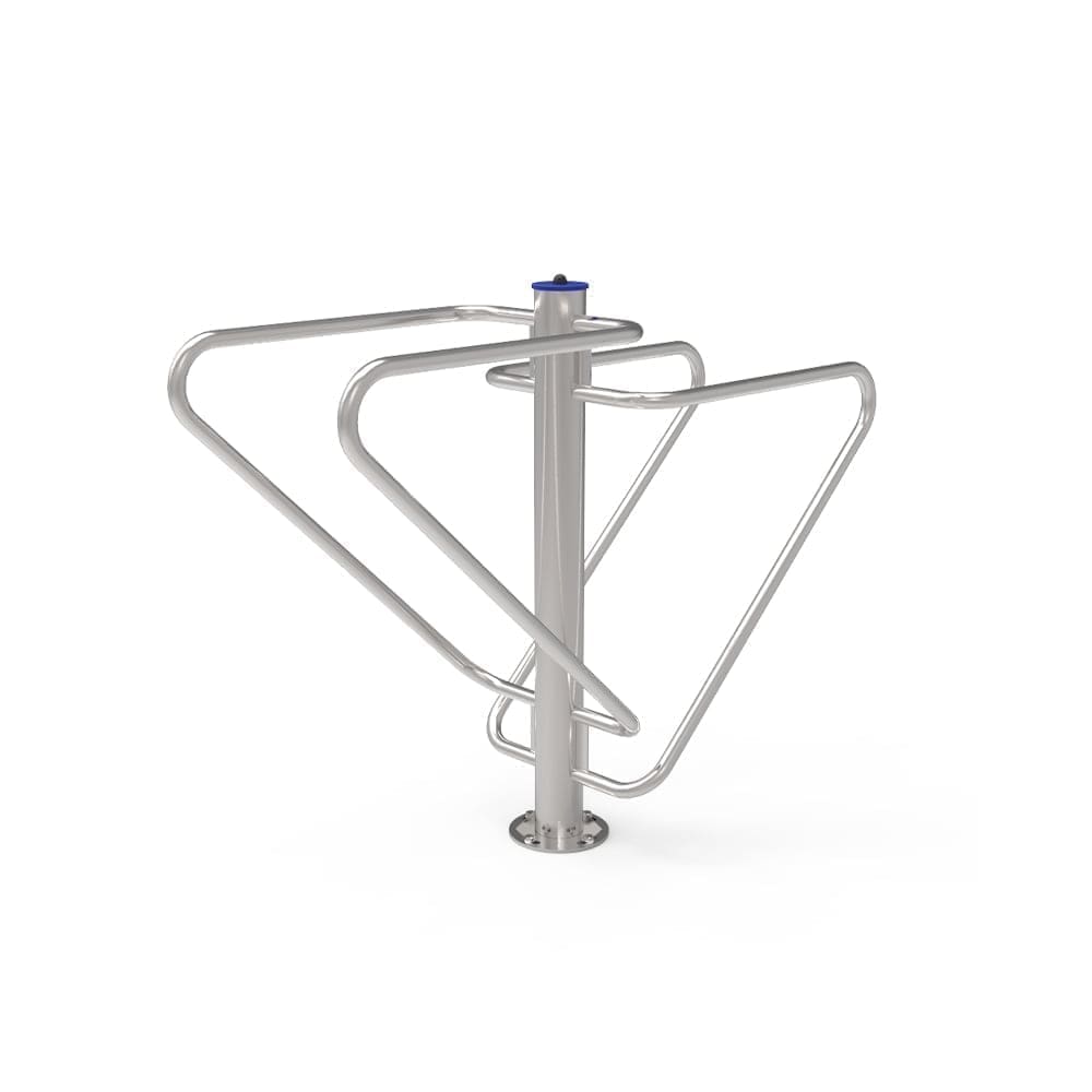 Compuesto por una estructura central en tubo estructural de Ø114, 3x3mm, restantes, en tubos de Ø40x3mm y chapa de acero carbono, decapado, con tratamiento primario a base de zinc C5 y acabado lacado a RAL gris forja a una temperatura de 230°C.
