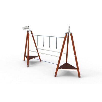 – 1 Puente Hilo (Hic – 0.58m) compuesto por 2 pasamanos en tubo Ø50mm de acero inox y una cuerda de paso reforzada en acero revestido por fibras de polipropileno Ø16mm, con cuerdas equilibrio de manos.
