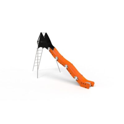 Descripción: tobogán compuesto por escalera de 7 peldaños en tubos de Ø30mm y Ø40mm respectivamente, superficie deslizante en acero inoxidable con paneles laterales protectores y decorativos en HDPE. Dos tubos de refuerzo en acero inoxidable 304.
