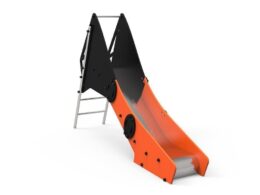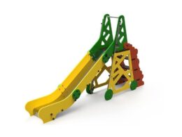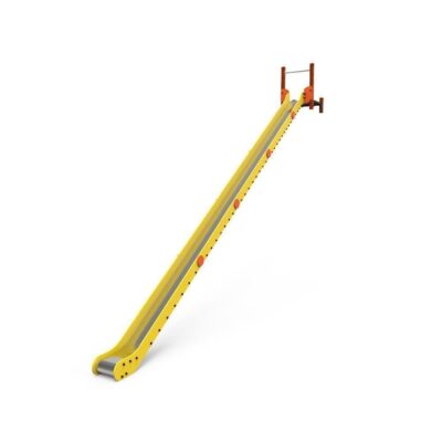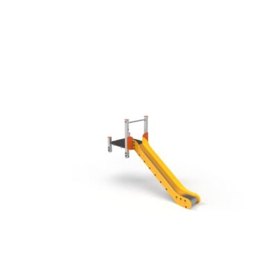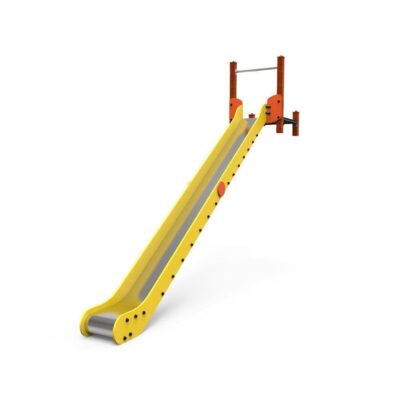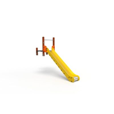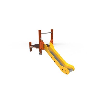 Descripción: tobogán compuesto por una torre sencilla sin techo con postes de madera color cerezo de 90x90mm y plataforma con estructura galvanizada recubierta de contrachapado marino antideslizante de color marrón.