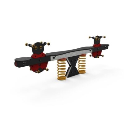 Descripción: Balancín Mariquitas (HIC – 0.85m). Compuesto por una estructura horizontal de aluminio de color natural, con sistema oscilatorio en acero galvanizado, 2 muelles color amarillo con refuerzo y 2 paneles en forma de Mariquita em HDPE con 4 apoyos en tubo de acero inox (uno para manos y otro para pies).