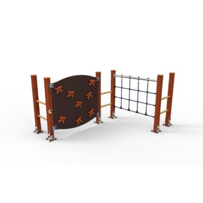 Descripción: Equipamiento de Escalada Apis (HIC – 1.30m). Compuesto por 3 escaleras con postes de madera con 2 peldaños, 1 panel de escalada de doble cara (HIC – 1.30m) en HDPE y 16 piedras de escalada “Dummy” en HDPE, 1 red vertical (HIC – 1.20m) en tejido de cuerda reforzada de acero revestido por fibras de polipropileno de Ø16mm con apoyo superior en tubo de Ø50mm en acero Inox.