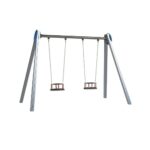 Descripción: Columpio doble “ZEA” (HIC – 1.25m). Composto por 2 pórticos simples, 2 barras horizontales de Ø80mm en acero galvanizado, sistema de rotación de acero inox con rodamientos, 6 postes de aluminio de 90x90mm, 2 paneles decorativos en HDPE, 1 asiento “bebé” y 2 asientos planos de goma termoplástica con cadenas galvanizadas de Ø5mm.