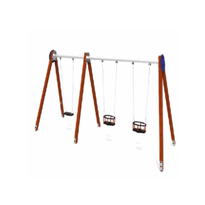 Descripción: Columpio ZEA (ACL: 1.40m), compuesto por pórtico doble, 2 barras horizontales de acero galvanizado de 80mm, 6 postes de madera color cerezo 90x90mm, 2 paneles decorativos en HDPE, 2 sillas bebé ,1 asiento plano en caucho termoplástico con cadenas galvanizadas Ø5mm y herrajes de acero electrozincado.