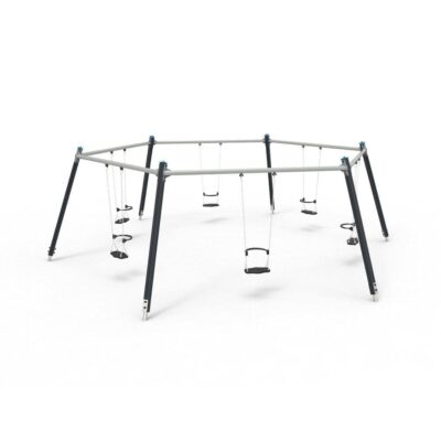 Descripción: Columpio Hexagonal (HIC – 1.40m) compuesto por un pórtico simple, seis barras horizontales Ø80mm de acero galvanizado, sistema de rotación en acero inox con