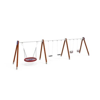 postes metálicos de 90x90mm color natural, 2 paneles decorativos en HDPE, 2 asientos planos de goma termoplástica, 2 sillas bebé y 1 asiento colectivo tipo nido de (ø1, 20m) con sistema de seguridad compuesto por cadenas galvanizadas de Ø5mm.