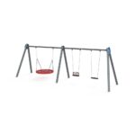 postes metálicos de 90x90mm color natural, 2 paneles decorativos en HDPE, 2 asientos planos de goma termoplástica, 2 sillas bebé y 1 asiento colectivo tipo nido de (ø1, 20m) con sistema de seguridad compuesto por cadenas galvanizadas de Ø5mm.