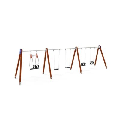Descripción: Columpio Zea Triple (ACL – 1.40m) compuesto por pórtico triple, 3 barras horizontales de acero galvanizado de Ø80mm, sistema de rotación de acero inoxidable con rodamientos, 8 postes de aluminio de 90x90mm, 2 asientos planos y 2 sillas bebé con goma termoplástica con cadenas galvanizadas Ø5mm y 1 asiento familiar tipo baby.