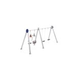 Descripción: Columpio Zea Triple (ACL – 1.40m) compuesto por pórtico triple, 3 barras horizontales de acero galvanizado de Ø80mm, sistema de rotación de acero inoxidable con rodamientos, 8 postes de aluminio de 90x90mm, 2 asientos planos y 2 sillas bebé con goma termoplástica con cadenas galvanizadas Ø5mm y 1 asiento familiar tipo baby.