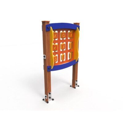 Descripción: Juego accesible a niños con movilidad reducida. Compuesto por 2 postes de aluminio 90x90mm, panel juego Tres en Raya compuesto por 9 piezas cuadradas rotativas (X&O) y paneles decorativos en HDPE.