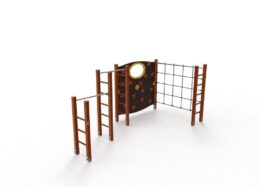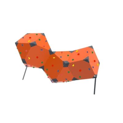 Descripción: Escalada “CUB 3” (HIC – 3.07m). Compuesto por paneles cuadrados y triangulares de escalada en HDPE naranja con piedras de escalada de poliamida. Uniones entre paneles en chapa de acero carbono decapado, con tratamiento primario a base de zinc C5 y acabado lacado a RAL 5010 Azul Genciana, a una temperatura de 230°C. Perno de anclaje y poste de apoyo en tubo redondo de ø60mm en acero carbono decapado, con tratamiento primario a base de zinc C5 y acabado lacado a RAL 5010 Azul Genciana, a una temperatura de 230°C.