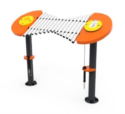 compuesto por estructura en tubos Ø80mm y chapa de acero de carbono, decapado, con tratamiento primario a base de zinc C5 y acabado lacado a RAL gris forja 600 deep blue, a temperatura de 230°C. Tubos musicales de aluminio de Ø30mm, soporte para smartphone y baquetas en HDPE con baquetas de nylon torneado.