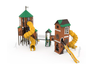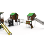 1 Torre laberíntica octogonal con tejado en HDPE (HIC -1.30m), postes metálicos de 90x90mm galvanizados y plataformas con estructura galvanizada revestida en HDPE negro.