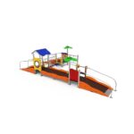 – 1 Puente Indio suspendido compuesto por red fabricada con cuerdas reforzadas de acero revestido por fibras de polipropileno Ø16mm con paneles en bragpo y pasamanos en tubo de acero inox;