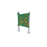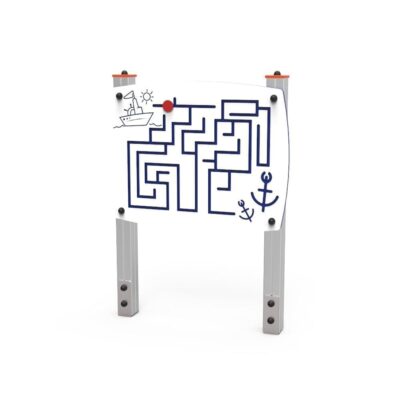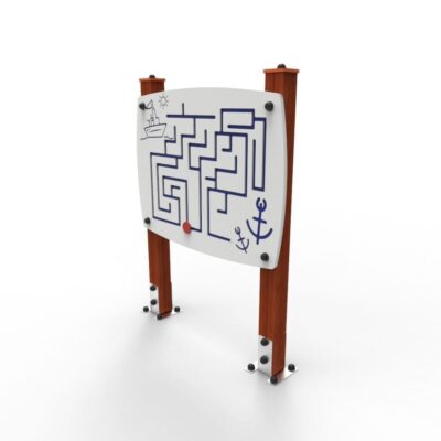 Descripción: juego lúdico accesible a niños con movilidad reducida, compuesto por 2 postes de aluminio de 90x90mm color natural, tablero de juego del laberinto pieza móvil ambos en