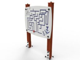 Descripción: Juego accesible a niños con movilidad reducida. Compuesto por 2 postes de aluminio, con panel de juego en HDPE, palillo de nylon torneado.