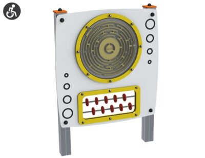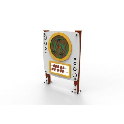 Descripción: Juego lúdico con postes de aluminio, panel HDPE blanco con juego de laberinto y detalles decorativos.