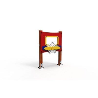 Descripción: juego lúdico accesible a niños con movilidad reducida, compuesto por 2 postes en madera 90x90mm color cerezo y 1 panel de juego en HDPE con panel de control y
