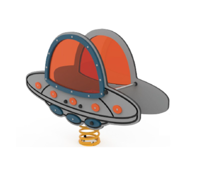 Muelle “UFO” (HIC – 0.60m), compuesto por 1 asiento y paneles en HDPE alusivos a la temática, 2 ventanas en acrílico, 1 tubo de acero Inox fijado para apoyo de manos y otro para