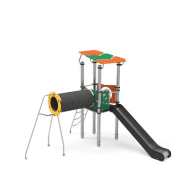 – 1 Tobogán en acero Inox (HIC 1,30m), con una superficie deslizante en acero inox con paneles laterales de protección y decorativos en HDPE .