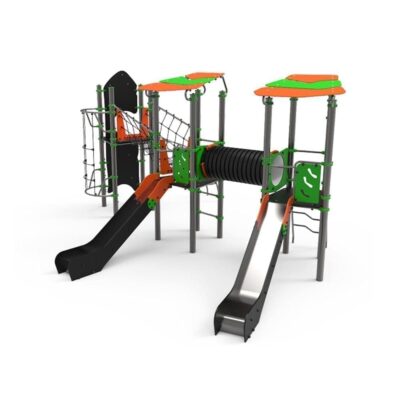 – 2 Toboganes de acero Inox (HIC – 1,30m) con superficie deslizante con paneles laterales de protección y decorativos en HDPE