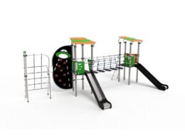 – 1 red de escalada 3D (ACL – 2,51m) con tela orgánica hecha de cuerda, pasamanos y postes redondos de Ø 114mm de acero inoxidable