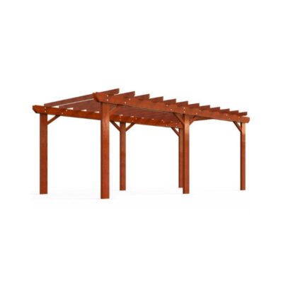 Fabricada en madera de pino color cerezo, tratada y barnizada. Compuesta por 6 postes de 90x90mm con apoyos metálicos y vigas de 147x43mm. Cubierta con listones de 107x43mm, espaciados entre sí.