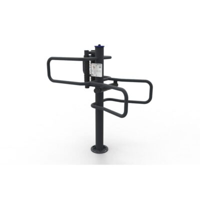 Compuesto por estructura central en tubo estructural Ø114,3x3mm, restantes en tubos de Ø60x3mm, Ø40x2mm y chapa en acero carbono decapado, con tratamiento primario a base de zinc C5 y acabado lacado a RAL gris forja a temperatura de 230°C.