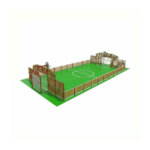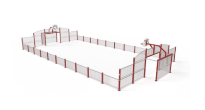 Descripción: Equipamiento para la práctica de fútbol, baloncesto, balonmano y tenis; accesible a personas con movilidad reducida. Compuesto por postes metálicos de 90x90mm galvanizados y lacados a RAL 3000 rojo fuego: vallado en tubo horizontal de 60x40mm, revestido con postes metálicos galvanizados, 2 porterías de fútbol anti vandálicas de 3180x1382x2047mm; 2 canastas de baloncesto con tablero de 900x1200mm en HDPE blanco y negro y una altura al solo de 3050mm, canasta en tubo de Ø16mm de acero carbono con tratamiento electrocincado y red de nylon.