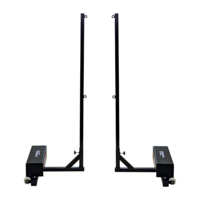 Juego de postes de bádminton trasladables metálicos con contrapesos incluidos y ruedas para poderlos trasladar cómodamente. Cuentan con refuerzo diagonal en la parte inferior, perfectos para colegios y clubes en entrenamientos o partidos.
