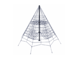 Descripción: Equipamiento de trepar em forma de pirámide con estructura en tubos de acer, redes y cuerdas. Incluido tobogán de acero inoxidable con paneles de HDPE en los laterales.