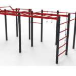 Descripción: estructura superior en tubo de 90x90mm y acero de carbono decapado de Ø40mm, con tratamiento primario a base de zinc C5 y acabado lacado a RAL 3000 llama roja, a una temperatura de 230°C.