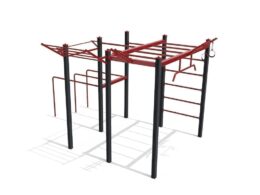 Descripción: compuesto por postes de 90x90mm galvanizados y lacados. Estructura superior en tubo de 90x90mm y Ø40mm en acero carbono decapado con tratamiento primario a base de zinc C5 y acabado lacado a RAL 3000 rojo fuego, a una temperatura de 230°C.