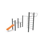 Descripción: compuesto por postes en metal de 90x90mm galvanizados y lacados, estructura superior en tubo de acero inoxidable 304 y bancos abdominales en HDPE.