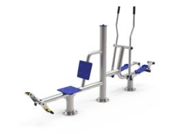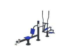 Compuesto por una estructura central en tubo estructural de Ø114,3x3mm, restante en tubo Ø60x3mm, Ø50x3mm y chapas de acero de carbono decapado, con tratamiento primario a base de zinc C5y acabado lacado a RAL gris forja a temperatura de 230°C.